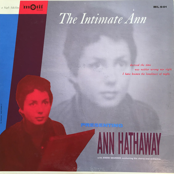 Ann Hathaway, a charming, energetic and talented singer of the soundscapes of Southern California, offered in her first and only album, 'The Intimate Ann' (1957), recorded for Hollywood’s Motif label, a tastefully crafted program marked by an expansive and personal style. Raised in music from childhood, Hathaway built an unusually solid career at an early age, performing on radio, with big bands, and in renowned clubs across the United States and Europe. Guided by Andre Brummer’s refined musical direction, the album blended jazz and classical sensibilities into an intimate, sensual setting that highlighted the depth, warmth and distinctive character of her voice.