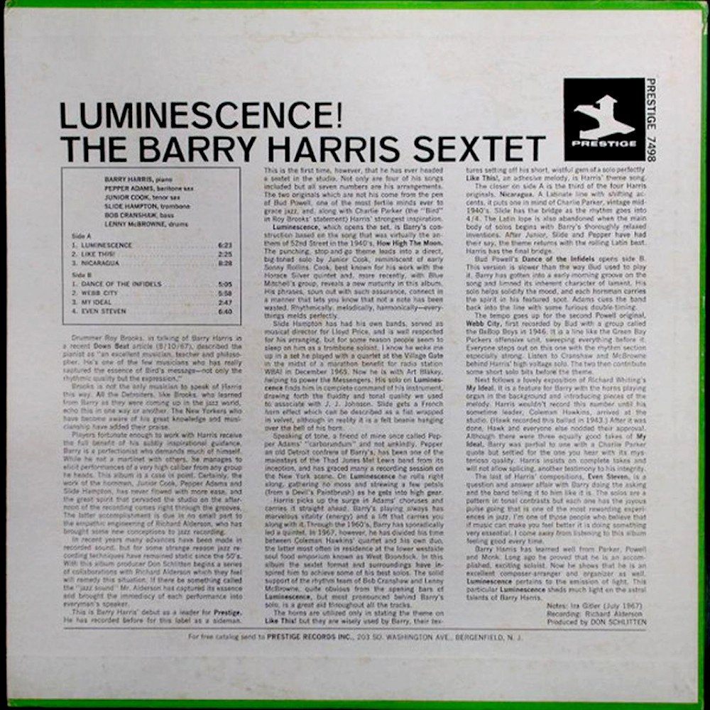 Barry Harris (p), Slide Hampton (tb), Junior Cook (ts), Pepper Adams (bs), Bob Cranshaw (b), Lenny McBrowne (d)