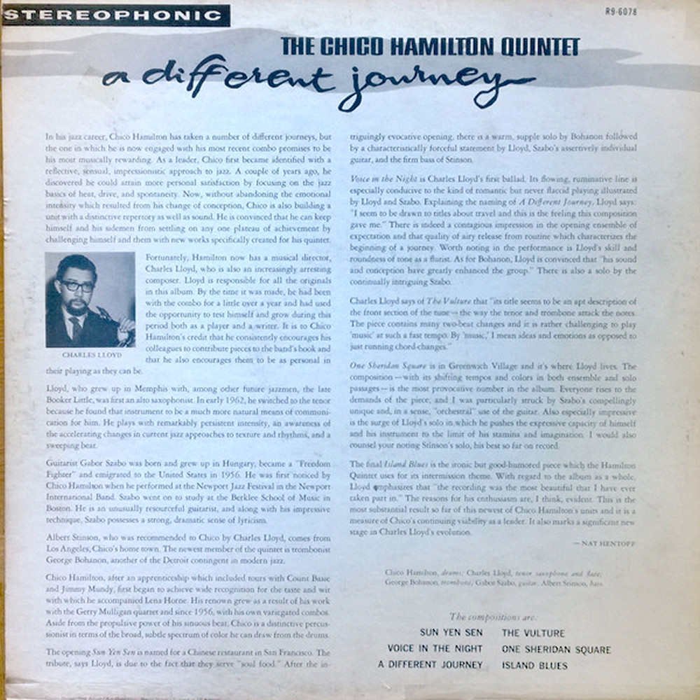 Chico Hamilton (d), Charles Lloyd (ts, fl), George Bohanon (tb), Gabor Szabo (g), Albert Stinson (b)