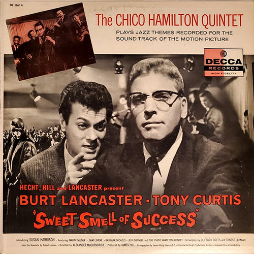 "The themes from the film Sweet Smell of Success (originally issued on the Decca label) surround the seedy side of Broadway/New York City social life. The plot involves syndicated gossip columnist J.J. Hunsecker (played by Burt Lancaster) and talent press agent Sidney Falco (portrayed by the brilliant young Tony Curtis), and their underhanded attempts to fabricate stories that touted or smeared certain clientele. Together they set up a highly publicized incestuous love affair including Hunsecker's sister and a jazz guitarist, much to the demise of all concerned. While the music is typical '50s film noir dark and passionately hued, it is also indicative of the jazz-oriented West Side Story style of intrigue that fit with the raconteur/mafia/gangster motif of earlier times. Elmer Bernstein's orchestra plays the principal music on this, his fourth movie soundtrack, with Chico Hamilton's groundbreaking quintet playing a handful of other tracks (also included on the Fresh Sound label Complete Studio Recordings) and participating onscreen during select scenes. Hamilton's sextet, and his cellist Fred Katz leading his own band complemented by other Los Angeles musicians expanded to an orchestra, provide the rest of the sounds.
