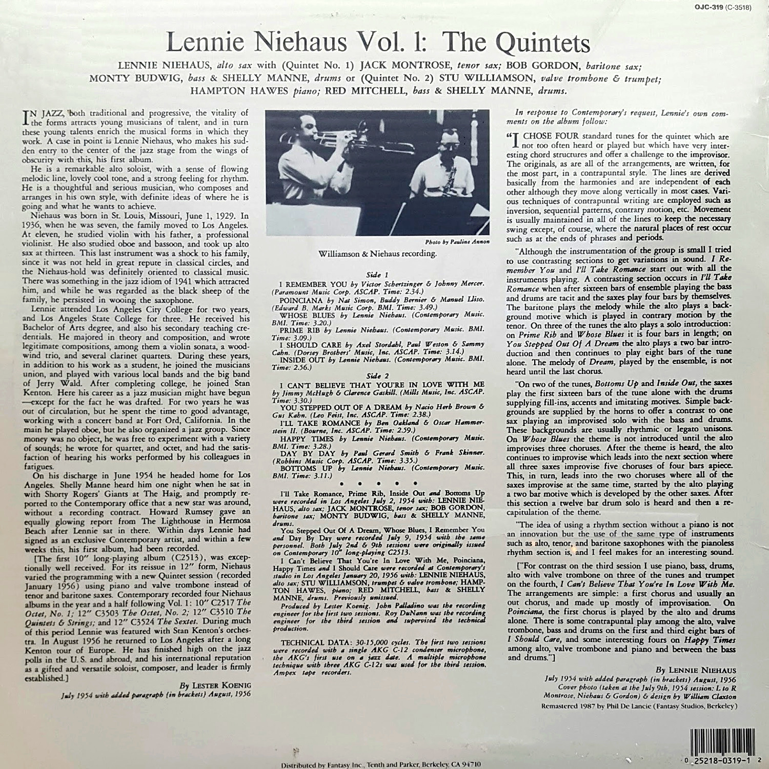 Lennie Niehaus (as), Stu Williamson (v-tb, tp), Jack Montrose (ts), Bob Gordon (bs), Hampton Hawes (p), Monty Budwig, Red Mitchell (b), Shelly Manne (d)