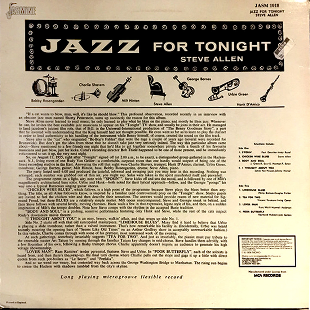 Steve Allen (p), Charlie Shavers (tp), Urbie Green (tb), Hank D'Amico (cl), George Barnes (g), Milt Hinton (b), Bobby Rosengarden (d)